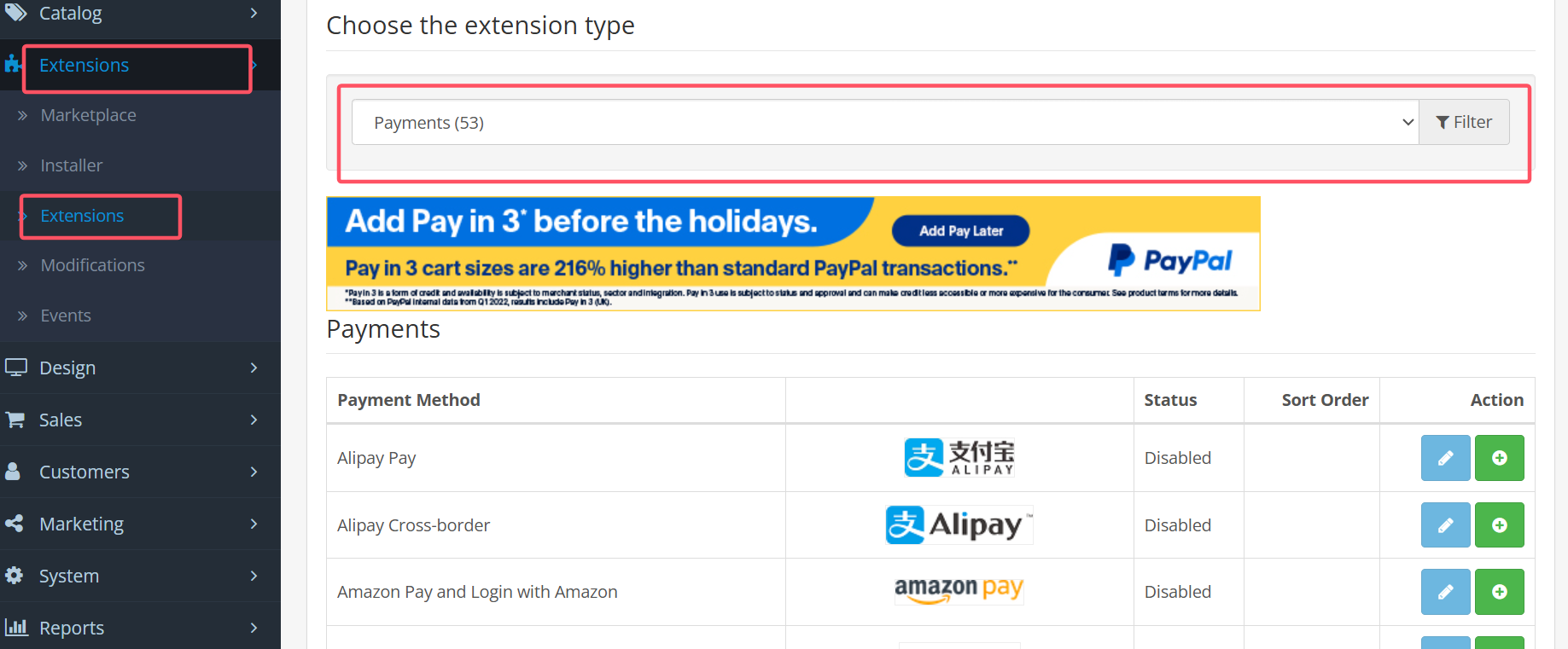登录 OpenCart 后台,进入 “扩展> 扩展 > 支付方式”,找到 “我的支付插件”,点击 “安装”,然后点击 “编辑” 配置订单状态等参数,最后启用插件。