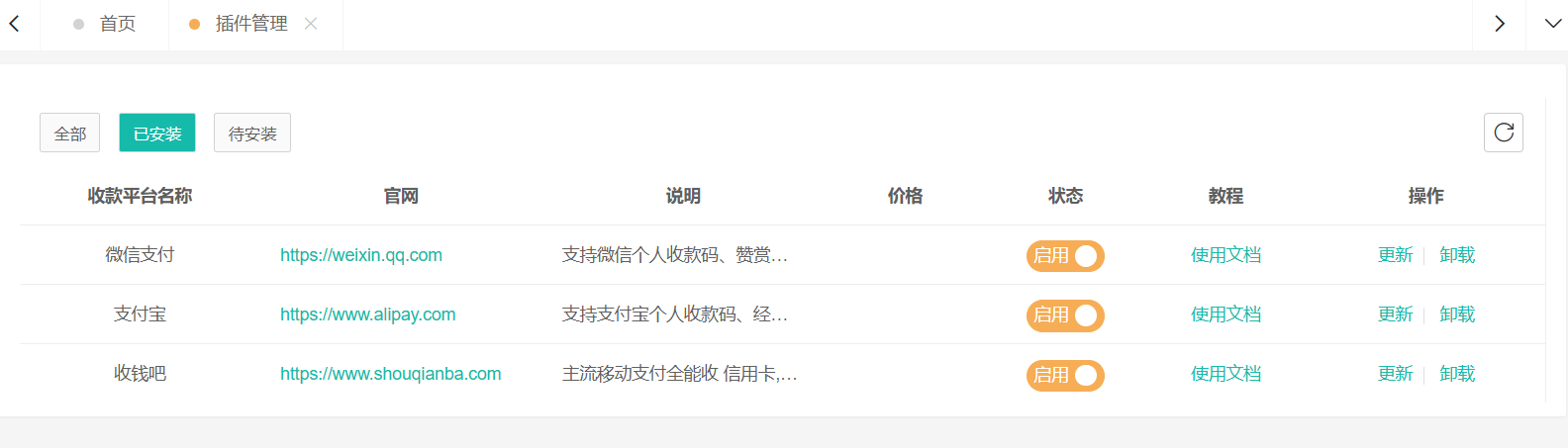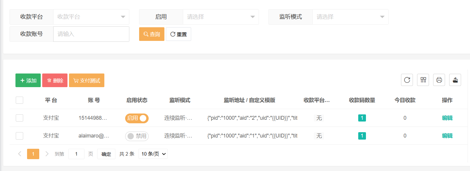 插件管理页面 收款账号管理页面 可以添加个人二维码来收款 手机端订单监控